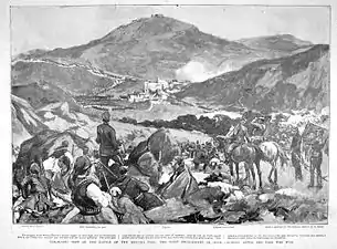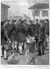 The 1st Division then marched toward Sarantaporo, arriving in the area on the night of 8 October 1912. The Ottoman VIII Corps, ordered to halt the Greek Army's advance north, had retreated and regrouped around the town. On 9 October 1912, during the Battle of Sarantaporo, the 1st Infantry Division, along with the 2nd and 3rd divisions, began a full frontal assault on Turkish positions. Withstanding heavy casualties during their advance, primarily due to accurate Turkish artillery barrage, the 1st Division managed to capture a shoulder and two nearby hillocks. On the division's right wing, the Konstantinopoulos Evzone Detachment (Απόσπασμα Ευζώνων Κωνσταντινόπουλου Apospasma Evzonon Konstadinopoulou) was able to advance and capture Turkish positions at Livadi. The Greek 4th Infantry Division, in the meantime, had broken through Turkish lines on the western flank and captured the Porta Pass.[5] On the night of 9 October 1912 Turkish forces, taking advantage of the bad weather, retreated and escaped encirclement. A Turkish battalion remained, facing the Konstantinopoulos Detachment's positions at Livadi, oblivious to their comrades' retreat. On the morning of 10 October 1912, the Evzones attacked the Turks, forcing them to retreat to Neochori.[2]