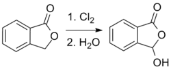 Also with other nucleophilic compounds, such as, thiols, amines, amides, etc., 3-hydroxyphthalide reacts without a catalyst to give the corresponding derivatives.[7] For example, it reacts with morpholine in 91% yield to 3-morpholinyl phthalide.[12] 3-Hydroxyphthalide reacts with thionyl chloride at the hydroxyl group smoothly (80-90% yield) to 3-chlorophthalide.[12] With Grignard reagents, the hydroxy group can be exchanged for the corresponding alkyl or aryl group:[2]