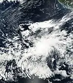 On July 11, a tropical wave moved off the African coast, and moved to the Lesser Antilles one week later. It passed over Central America near Panama on July 22 without any increase in organization. On July 25, the wave began to show curved banding, showing that it had become better organized. It intensified to a tropical depression on July 26 while located south southwest of Manzanillo, Mexico, designated as Tropical Depression Seven-E. The depression was upgraded to Tropical Storm Emilia later that day while moving northwest, steered by a mid-level ridge to its north.[19] During this time, Emilia was forecast to strengthen to a hurricane within two days, due to the system moving over warm waters.[20] However, late on July 27, the storm began to accelerate, meaning that it will move into cooler waters sooner than firstly anticipated, therefore, only allowing the storm to intensify within a few hours before weakening.[21] Emilia moved near Socorro Island and its intensity peaked with wind speeds of 65 mph (105 km/h), with an eyewall beginning to form. A few hours later, the storm moved into cooler waters and drier air, and Emilia's deep convection dissipated, weakening the storm.[19] Late on July 28 deep convection redeveloped near the storm's center, but wind shear prevented Emilia from strengthening.[22] It turned to the west and weakened below tropical storm intensity on July 29,[19] as the deep convection in the storm diminished again.[23] It shortly dissipated while located several hundred miles west south-west of Cabo San Lucas, Mexico.[19]