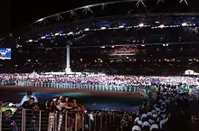 The flags from all countries entered with their flag bearers before placing their flags on the Geode stage. Then, after the flags all entered, athletes ran in from all entrances onto the field, while an fanfare 'Olympic Fireworks' by David Stanhope and orchestral piece 'Journey of Angels' by Chong Lim played. Savage Garden performed their hit song 'Affirmation' on the Geode stage while wearing indigenous flag t-shirts. The Geode stage was projected different words relating to what people might affirm about their beliefs. One of the words included Sydney's famous graffiti, Eternity.[2]