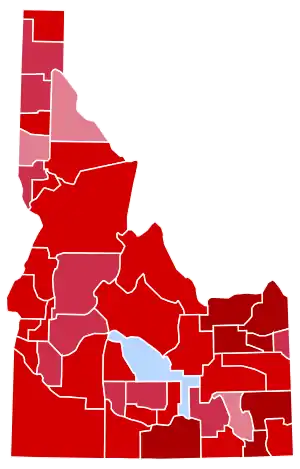 | Blaine County (2.78%) | Shoshone County (12.14%) Latah County (16.33%) Bannock County (23.77%) Ada County (27.86%) Bonner County (31.83%) Kootenai County (33.49%) Nez Perce County (34.84%) Valley County (35.67%) Teton County (38.37%) Lincoln County (38.89%) |