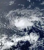 A tropical wave emerged into the Atlantic from the west coast of Africa on July 7. Moving westward, the system displayed signs of a weak low-level circulation beginning on July 10, and after deep convection formed on the following day, a tropical depression developed around 18:00 UTC about 1,150 mi (1,850 km) east of the Windward Islands. A subtropical ridge north of the depression caused it to move west-northwestward at roughly 17 mph (27 km/h). Vertical wind shear prevented the cyclone from intensifying beyond sustained winds of 30 mph (45 km/h) and an atmospheric pressure of 1,010 mbar (30 inHg), with dissipation occurring late on July 12 approximately 690 mi (1,110 km) east of the Windward Islands. The remnant tropical wave reached the Lesser Antilles on July 13 and July 14.[19]