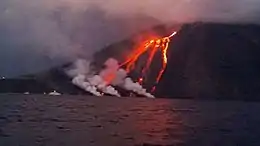 The 2002 Stromboli tsunami was a tsunami caused by a volcanic eruption on the island of Stromboli, in the Aeolian Islands of Sicily, located on the Tyrrhenian Sea. In May 2002, one of the island's two active volcanoes, called Stromboli, entered a new phase of explosive activity that was initially characterized by gas and ash emission from the summit craters.[1] On December 30, 2002, the seismic network recorded two large collapses of a huge portion of the Sciara del Fuoco, which resulted in the tsunamis. The first landslide was around 13:15 and the second one around 13:23 which lasted for 5–7 minutes. The event caused damages on the eastern coast side of Stromboli and Panarea.[2] These tsunamis have been considered the most violent ones that have struck Stromboli in the past 100 years.