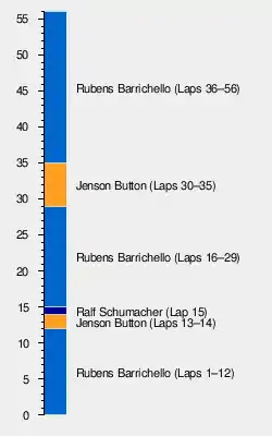 Following a clean start, Rubens Barrichello won the race with Jenson Button in second and Kimi Räikkönen in third place. Michael Schumacher finished in 12th place after a race with several incidents, including a collision, a spin and a puncture.