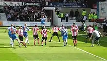 3rd-place Brentford met 6th-place Swansea City in the League One play-off semi-finals, but despite taking the lead at the Liberty Stadium and largely controlling the first leg, Swans defender Sam Ricketts salvaged a 1–1 draw with a deflected shot in the dying minutes.[13] Two quick-fire goals from Swansea City forward Leon Knight in the first 15 minutes of the second leg at Griffin Park killed the tie and Brentford exited the play-offs 3–1 on aggregate.[14]