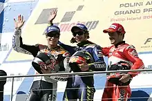 Nicky Hayden, Valentino Rossi and Carlos Checa on the podium after finishing second, first and third in the MotoGP race.