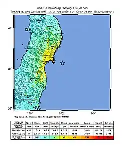 - "Magnitude 7.2 – NEAR THE EAST COAST OF HONSHU, JAPAN". U.S. Geological Survey. August 16, 2005. Archived from the original on December 18, 2009. Retrieved June 20, 2006.