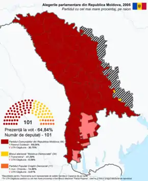 Parliamentary elections were held in Moldova on 6 March 2005.[1] The result was a victory for the Party of Communists of the Republic of Moldova (PCRM), which won 56 of the 101 seats.[2]