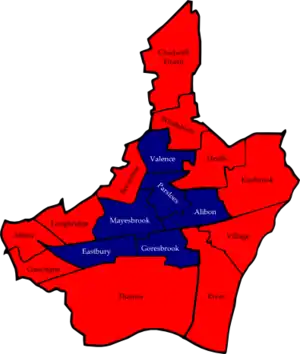 ![]() Map of the results of the 2006 Barking and Dagenham council election. Labour in red, British National Party in dark blue and Conservatives in blue. | |||||||||||||||||||||||||||||||||