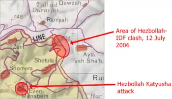 At around 9 am local time on 12 July 2006, Hezbollah launched diversionary rocket attacks toward Israeli military positions near the coast and near the border village of Zar'it[78] as well as on the Israeli town of Shlomi and other villages.[79] Five civilians were injured.[80] Six Israeli military positions were fired on, and the surveillance cameras knocked out.[81]