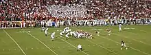 On July 19, a preseason poll voted on by members of the media that cover the Big 12 was released. The Sooners were chosen to finish second in the Big 12 South behind Texas. They finished nine votes behind the Longhorns but 44 points above Texas A&M, the third team.[1] This poll was released in anticipation of the Big 12 media day which began on July 23, 2007. Most publications had the Sooners ranked between five and ten in the preseason.[2][3][4][5] Phil Steele's self-titled publication, which is considered by many to be the most accurate college football preseason prediction magazine,[6] had the Sooners ranked number three in terms of how they would finish the year and how strong the team is going into the year.[7] On August 2, 2007, Coach Bob Stoops announced at a rally that the names of players would be put back on the team's jerseys. They had been removed in a re-design before the 2006 season.[8]