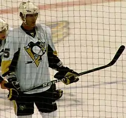 The Penguins won their first six games in November before losing in a shootout on November 18.[26] Rob Scuderi and Hal Gill were selected by Therrien to be November's alternate captains, taking over for Brooks Orpik and Malkin who served in October.[27] On November 11, the Penguins returned to Detroit for the first time since the 2008 Stanley Cup Finals.[28] The third goal of Jordan Staal's second career hat-trick came with 22.8 seconds remaining in regulation, sending the game into overtime where the Penguins achieved a 7–6 victory.[29] Malkin's 13-game point streak ended on November 18, during the streak he scored 27 points.[30] Through November 19, the Penguins led the league in overtime games with nine of 18 games taking extra time to decide.[31] Through the first 20 games of the season, Mike Zigomanis led the league in faceoff percentage and Alex Goligoski led rookie defensemen in points.[32] After an injury to Marc-Andre Fleury, Dany Sabourin and rookie John Curry split goaltending duties in his multi-game absence in which the team was 5–6–2.[33][34] On November 26, Malkin scored three goals for his third career hat-trick,[35] three days later Sidney Crosby also achieved a hat trick—the second of his career.[36] After the team's final game of the month, Malkin and Crosby ranked first and second in league scoring with 39 and 34 points respectively.[37] Malkin also ranked first in the league with 29 assists,[37] and was named the NHL's second Star of the Month.[38]