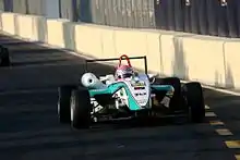 Mortara's brake locking dropped him to fourth behind Campos-Hull and Alguersuari.[32] Meanwhile, Kunimoto started to pull away from the rest of the field.[36] Alguersuari got back past Campos-Hull for second on the fifth lap and Mortara overtook the latter for third on the next lap.[32] As he began to reduce the time deficit to Kunimoto, Alguersuari's chances of winning were diminished when he was deemed to have jumped the start and was told he would incur a drive-through penalty.[32][33] Alguersuari took his penalty at the end of lap five and Mortara began reducing Kunimoto's lead of 2½ seconds.[33] As the race appeared to settle into calmness, Matsushita went into the wall after leaving the Mandarin Bend and temporarily blocked the track. Winslow drifted off the circuit at Police turn and hit the wall. Lancaster relinquished sixth place to Hartley while Mäki was now in the top ten.[36] The safety car was called to neutralise the race on lap eight when Merhi spun at Reservoir Bend and heavily damaged his car.[32] The incident caught the recovering Van Dam off guard who clipped debris and crashed.[33][36] Kunimoto's lead had now evaporated and he was followed by Mortara, Campos-Hull, Cozzolino and Hartley.[36]