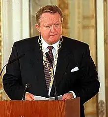 President Ahtisaari supported Finland's entry into the European Union, and in a 1994 referendum, 57 percent of Finnish voters were in favour of EU membership.[23] He later stated that if Finland had not voted to join the EU he would have resigned.[24] During Ahtisaari's term as president, Boris Yeltsin and Bill Clinton met in Helsinki.[25] He also negotiated alongside Viktor Chernomyrdin with Slobodan Milošević to end the fighting in the Yugoslav province of Kosovo in 1999.[26]
