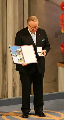 Ahtisaari was a United Nations special envoy for Kosovo, charged with organizing the Kosovo status process negotiations, aimed at resolving a long-running dispute in Kosovo, which later declared its independence from Serbia in 2008. In October 2008, he was awarded the Nobel Peace Prize "for his important efforts, on several continents and over more than three decades, to resolve international conflicts".[2] The Nobel statement said that Ahtisaari had played a prominent role in resolving serious and long-lasting conflicts, including ones in Namibia, Aceh (Indonesia),[3] Kosovo and Serbia, and Iraq.[4]