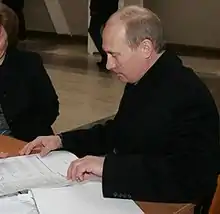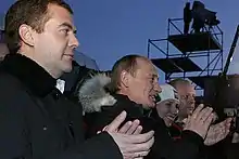 In January 2008, Medvedev launched his presidential campaign with stops in the regions.[21] In his first speech since he was endorsed, Medvedev announced that, as president, he would appoint Vladimir Putin to the post of prime minister to head the Russian government.[22] Although constitutionally barred from a third consecutive presidential term, such a role would allow Putin to continue as an influential figure in Russian politics[23] Putin pledged that he would accept the position of prime minister should Medvedev be elected president. Election posters portrayed the pair side by side with the slogan "Together we will win" ("Вместе победим").[24]