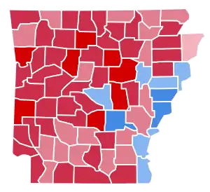 Arkansas was won by Republican John McCain by a 19.9% margin of victory, an even greater margin than George W. Bush attained in 2004, despite the national Democratic trend. This was likely due to the issue of race in the presidential election.[1] Prior to the election, all 17 news organizations considered this a state McCain would win, or otherwise a red state. The state trended Republican dramatically in 2008, as McCain performed over 4% better than Bush did in 2004, more than any other state. Only five counties swung more Democratic in 2008, and the vast majority of counties swung heavily Republican, some by as much as 30%.[2] Of the ten counties with the largest percentage swing to the Republicans in the U.S. during this election, six of them were located in Arkansas.[3] Obama became the first Democrat to win the White House without carrying Arkansas. It was also one of the six states where neither Obama nor McCain won during the primary season, and the strongest of five states that swung rightward in this election, the others being Oklahoma, Louisiana, Tennessee, and West Virginia. This was the first time Arkansas did not vote for the winner of the presidential election since 1968. As of 2020, this is the last time Arkansas voted to the left of Alabama. This was also the first time Arkansas voted to the right of Nebraska.