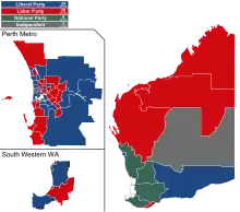 ![]() The map on the left shows the first party preference by electorate. The map on the right shows the final two-party preferred vote result by electorate. | |||||||||||||||||||||||||||||||||||||||||