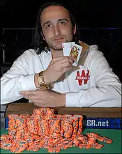 Highlights of the 2008 series include the selection of Erick Lindgren as the Player of the Year. Before the 2008 WSOP, Lindgren, who won a bracelet and made three final tables, was widely considered to be the "best player to never win a WSOP bracelet”.[3] Phil Hellmuth, a Poker Hall of Famer, set new records for the most WSOP career cashes (68) and most WSOP career final tables (41).[4] Nikolay Evdakov led all players with a record 10 money finishes.[5] The Main Event, which began with 6,844 participants (a level exceeded only by the number of participants at the 2006 event), was suspended once the event was down to the nine players needed for the final table; the Main Event was resumed on November 9 and concluded with the heads-up final between Peter Eastgate and Ivan Demidov the next day. This year was the first in which the Main Event was suspended in this fashion, a change introduced at ESPN's request to allow the television network to do a same-day Main Event broadcast.[6]