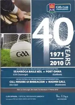 The 2009–10 All-Ireland Senior Club Hurling Championship was the 40th staging of Ireland's premier inter-county club hurling competition since its establishment by the Gaelic Athletic Association in 1970–71. A total of 15 teams competed in the championship, with Ballyhale Shamrocks unseating the two-time defending champions Portumna by 1–19 to 0–17 in the final at Croke Park, Dublin.[1] The championship began on 11 October 2009 and concluded on 17 March 2010.