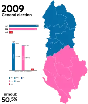 Prior to the election, the electoral law was changed to a regional and proportional system.[3][4] Polls from March and April 2009 saw a very close race, with both the governing Democratic Party of Albania and the opposition Socialist Party of Albania around 37%, with minor parties like the Socialist Movement for Integration, the G99 Movement, the Unity for Human Rights Party and the Republican Party of Albania in the low single digits.[5]
