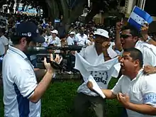 There were demonstrations supporting and opposing Zelaya's removal from power. The Zelaya administration was investigated and prosecuted in the absence of Zelaya.[101][102] Some organisations reported human rights violations[76][103][104][105][106][107] and media restrictions.[108]