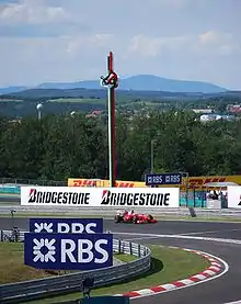The 2009 Hungarian Grand Prix (officially known as the Formula 1 ING Magyar Nagydíj 2009)[3] was a Formula One motor race held on 26 July 2009 at the Hungaroring in Mogyoród, 18 km (11 mi) north of Budapest, Hungary.[1] It was the tenth race of the 2009 Formula One season. The 70-lap race was won by 2008 world champion Lewis Hamilton for McLaren-Mercedes, after starting from fourth place on the grid. The 2007 world champion Kimi Räikkönen finished second for Ferrari, with Red Bull Racing's Mark Webber finishing third.[4] Championship leader Jenson Button had a poor race to finish seventh, losing ground to Webber in the championship.
