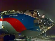 One of the aircraft was landing in freezing fog[1] with 31 crew and passengers on board, while the other, having disembarked all of its passengers, was taxiing for take-off. The taxiing Il-76 crossed the taxiway end-line but did not report its position to air traffic control (ATC). ATC gave permission to the approaching Il-76 to land. Due to a sudden gust of wind, the landing aircraft deviated to the right and struck the taxiing Il-76's cockpit with its wing. Both aircraft then caught fire. The airport was closed until the following morning.[2]