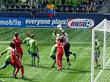 The following 5 weeks the Sounders managed to gain 5 points in the standings as they tied each game. First, a 1–1 tie at the Chicago Fire in which striker Fredy Montero was sent off in the 48th minute for an elbow to the face of Gonzalo Segares while both players went up for a ball in the air.[52] Then another 1–1 tie the next week at home against the Los Angeles Galaxy in which yet another red card was issued, to James Riley this time, in the 57th minute for a "phantom blow" to Mike Magee as the two got into a scrum.[53] Two more away ties followed, first against FC Dallas 1–1 and then another at Colorado, 2–2. Ljungberg missed three games during this period due to migraine headaches.[54] May 31, 2009 Sounders FC then returned home for their 5th consecutive tie in league play, this time 1–1 against the Columbus Crew in which Tyrone Marshal was ejected in the 92nd minute when he threw what the referee believed was a punch at Steven Lenhart in retaliation for an elbow. The Sounders accumulated another three yellow cards throughout the match.[55] Jaqua's goal received Goal of the Week honors.