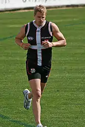 Prior to the first bounce, Nick Maxwell of Collingwood won the coin toss, and chose to kick to the (western) City End. Collingwood almost scored the opening goal in the first minute of the game, but an off-the-ball free kick against Dane Swan stripped Travis Cloke of a set shot from the goal square. The first score was registered in the 5th minute, a goal from a set shot by Tyson Goldsack.[31] Up until the 11th minute, Collingwood won the inside-50s 6–1. Johnson scored a goal for Collingwood in the 12th minute, and the Magpies led 14–0 after twenty minutes. St Kilda's first score came in the 21st minute in dramatic fashion, with a defensive effort from Heath Shaw turning a near-certain goal into a behind: Nick Riewoldt had marked 2 metres from goal in the goal square, and turned to play on, only to have Shaw dive across him from behind as he was dropping the ball, spoiling the ball before it reached Riewoldt's foot, and rushing the ball through for a behind. Brent Macaffer scored a crumbing goal for Collingwood from the goal square a minute later to extend the margin to 19 points. Riewoldt would get one more chance to get a goal at the last minute, but his 45-metre kick missed to the left. Collingwood led by 18 points at quarter time, and St Kilda was held goalless in the first quarter.[31]