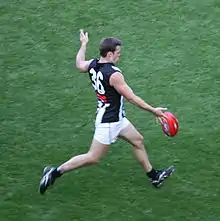 St Kilda dominated in the first half of the second quarter, with a first score registered 33 seconds after the bounce. However, they could not put pressure on the scoreboard, kicking five behinds in the first fourteen minutes of the quarter—three of which were scored by Sam Gilbert while on the run—to take St Kilda's total score to only 0.7 (7), while Alan Didak scored a goal for Collingwood from the goal square in the 6th minute.[31] Brendon Goddard finally scored St Kilda's first goal in the 15th minute from a 20-metre set shot. After missing two difficult shots at goal in the 17th and 18th minutes, Collingwood goalled twice in a space of one minute, through Macaffer and Jolly.[31] The end of the quarter was filled with physical one-on-one contests with Collingwood willing to play for time, and no more goals were scored in the quarter. Two more opportunities for Collingwood ended up behinds but kept the pressure on St Kilda. Finally, Schneider had a set shot from 30m as the siren sounded, but only managed a behind. In general play, the second quarter was fairly even, with St Kilda winning the inside-50s 13–10, but while none of their missed opportunities were easy shots, the Saints' inability to convert the chances they had contributed to their increasing deficit. Collingwood won the quarter 3.3 (21) to St Kilda's 1.6 (12) and took a 27-point lead into half time.[29]