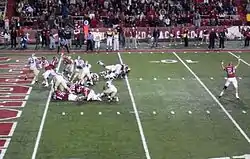 The Hogs scored first only minutes into the game on a Mallett pass to Chris Gragg for a 57-yard score. Georgia freshman QB Aaron Murray scored on the ground to even the score. The Hogs responded with a Knile Davis rushing score, and a Zach Hocker field goal to take a 17–7 lead into half. After the break, Georgia kicker Blair Walsh recorded a field goal, but Mallett found Ronnie Wingo to reply. Behind by fourteen points, Georgia stormed back with Tavarres King and Washaun Ealey both scoring touchdowns to knot the game in the fourth quarter. Georgia had a chance to win the game, but a sack by Jake Bequette that tore Murry's helmet off ended the drive and forced UGA to punt.[31] Given a chance to win the game, Mallett completed two passes to D. J. Williams to move the Hogs to the UGA 40. Childs caught a perfect pass from Mallett along the left side, and after breaking a tackle, dashed 40 yards for the game-winning score with fifteen seconds remaining.[32] Mallett was 3 of 3 for 73 yards on the final game-winning drive, confirming his status as a Heisman Trophy contender.[33]