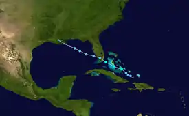 A non-tropical area of low pressure, first noted over the Gulf Stream on August 7, entered the southeastern Gulf of Mexico and organized into a tropical depression about 120 mi (195 km) west of Fort Myers, Florida, by 18:00 UTC on August 10. As the newly formed cyclone moved west-northwest, a nearby upper-level low imparted high wind shear and dry air entrainment, and the depression degenerated into a remnant low twelve hours later without attaining tropical storm intensity. Upon degeneration, the low moved into the Gulf Coast of the United States and conducted a clockwise loop.[64] It emerged into the Gulf of Mexico again on August 16, where the disturbance nearly regenerated into a tropical cyclone before making a second landfall in Mississippi the next day.[65] The remnants dissipated over the southeastern portion of the state on August 18.[64]