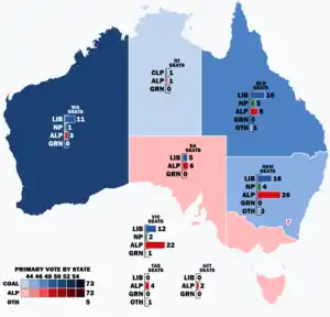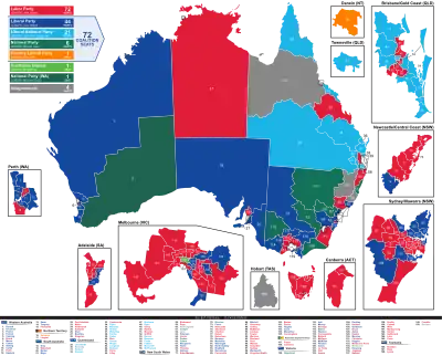 Labor and the Coalition each won 72 seats in the 150-seat House of Representatives, a loss of eleven and a gain of seven respectively. Labor retained a majority of seats in a majority of states against the Coalition − New South Wales (26 to 20), Victoria (22 to 14), South Australia (6 to 5), and Tasmania (4 to 0), but fell sharply in Queensland (8 to 21) with a pre-existing minority in Western Australia (3 to 11). Labor won their largest two-party preferred vote in Victoria and Tasmania since official two-party records began in 1949, and in South Australia, their fourth-largest.[22]
