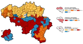 After polls showed the N-VA receiving 29% of votes in their region, media interpreted the election as a "victory for Flemish independence".[25] The following tables contain percentages on the national level (i.e. the result of N-VA is 17.4% on the national level, while it is 27.8% on the regional level).