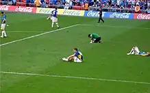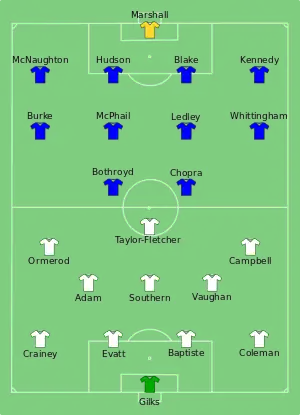 Cardiff kicked off the match around 3 p.m. in front of a Wembley Stadium crowd of 82,244.[36][37] They began as the more attacking of the teams, with Peter Whittingham playing a cross into the box where Chopra was able to beat opposition defender Alex Baptiste to the ball, hitting the crossbar with his resulting shot four minutes into the match.[37][38] Five minutes later, Whittingham again played in Chopra, allowing the striker to score past Blackpool goalkeeper Matt Gilks into the bottom corner of the net. Four minutes later Cardiff conceded a free kick on the edge of their penalty area when Stephen McPhail was adjudged by Marriner to have deliberately handled the ball. Adam hit the free kick around the wall and into the net to equalise. After fifteen minutes Cardiff's Bothroyd succumbed to his pre-existing hamstring injury and was substituted,[26] being replaced by loan player Kelvin Etuhu. Blackpool were able to gain control of the game as Cardiff adjusted to the change,[26] with both Stephen Crainey and DJ Campbell shooting wide from outside the penalty area.[30]