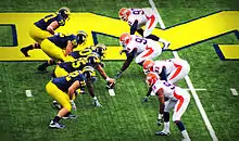 The team also faced uncertainty relating to who would be the starting quarterback.[10] While it was expected that Tate Forcier would retain his starting job, the build-up to the season led to a quarterback controversy that turned into a three-way battle between Forcier, Denard Robinson, and highly touted recruit Devin Gardner.[10] On defense, Michigan installed a new 3–3–5 formation that the coaches hoped would better suit the players currently on the team.[10] Michigan lost several key players from the previous season, including DE Brandon Graham, the 2009 Big Ten defensive Most Valuable Player, RB's Brandon Minor and Carlos Brown, LB Stevie Brown, and CB Donovan Warren.[4] Michigan suffered a severe blow to its defensive secondary during fall practice, as starting CB Troy Woolfolk suffered a dislocated ankle that ended his season before it began.[11]