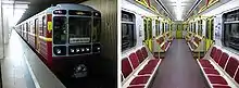 The first explosion occurred on the Red Arrow – 75 years train at the Lubyanka station at approximately 7:56 am local time (03:56 UTC). The train started from Yugo-Zapadnaya, and stopped at Lubyanka station. Once the train doors opened, explosives worn by a woman standing at the second carriage's second exit detonated. The explosive had a force of up to 1.5 kg of trinitrotoluene (TNT).[18] Fifteen people on board the train, and eleven people on the platform, were killed. One victim from the third carriage died from a head injury caused by an 8 mm (0.31 in) piece of metal.[19]