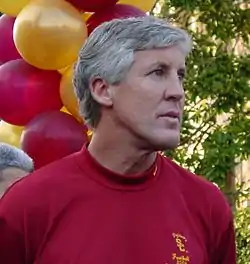 Within days after Carroll was hired, the rest of the coaching staff was revamped. With the exceptions of Gus Bradley and Dan Quinn, none of the coaches from Mora's tenure returned.[9] USC Football offensive coordinator Jeremy Bates joined as the Seahawks offensive coordinator, while Alex Gibbs from the Houston Texans would serve as offensive line coach and assistant head coach.[10] However, weeks before the start of the NFL regular season, Gibbs would suddenly retire from the position, with Carroll's former USC assistant Pat Ruel to take his spot.[11]