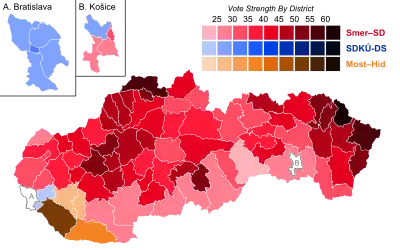 Incumbent Prime Minister Robert Fico's Direction – Social Democracy (Smer) party increased its seat share by 12 to 62. However, Fico faced an uphill battle to remain prime minister, as his coalition partners were decimated. The Slovak National Party barely passed the 5% vote threshold required for parliamentary representation while losing 11 of their 20 seats, while the People's Party – Movement for a Democratic Slovakia was shut out of the chamber altogether.[10] Despite the setback, Fico said that he wanted to try to form a cabinet even though his leftist coalition could only command 71 of the 150 parliament seats and would thus force the need for at least one of the opposing centre-right parties.[10] This has been described as an unlikely, but possible, occurrence,[10] because opposition parties stated during the election that they would not enter government with Fico. One analyst said that he "strictly rule[d] out that any of the centre-right parties could team up with Smer."[11]
