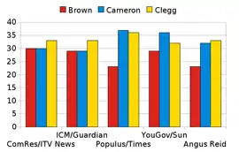 - Angus Reid: 37% for Cameron, 29% for Clegg, and 23% for Brown[33]
