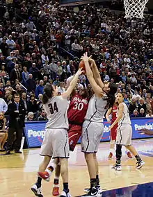The next game matched the number two and number three ranked teams in the country, with UConn playing at Notre Dame. The game was close throughout, with UConn holding a slim two-point lead in the final minute, but Notre Dame forced overtime, and out scored the Huskies by seven points in the extra period, to win 74–67. It was the first Huskies regular season Big East loss after 57 consecutive victories.[31] The Huskies rebounded from their loss with a win over Providence, in which every one of the eleven players scored. The team was shooting over 70% from the floor in the first half, and went on to win 96–35.[32]