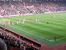 On 2 September the Saints hosted last season's runners-up Manchester United in their third game on the season. Rickie Lambert opened the scoring for the home side with his second goal of the season in the 16th minute, heading in a Jason Puncheon cross.[49][50] The lead was cancelled out just seven minutes later however, as new United signing Robin van Persie equalised.[49][50] The first half ended level, and it took until the 55th minute for the deadlock to be broken, with Morgan Schneiderlin putting Southampton ahead for the second time in the match.[49][50] 15 minutes later the visitors were awarded a penalty due to a foul by Jos Hooiveld on Van Persie, although it was saved by Kelvin Davis to keep Saints ahead.[49][50] In the 87th minute however, Van Persie scored his second of the match to equalise for the second time, and he completed a hat-trick in stoppage time to secure United's win and subject the Saints to their third loss in three games, leaving them bottom of the table as the only club yet to have picked up a point.[49][50]