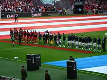 Both clubs received an allocation of approximately 31,000 tickets. Cardiff fans would be housed in the East End of the stadium, while Liverpool fans were allocated the West End of the stadium.[30] Ticket prices were increased from last year's final, with the most expensive tickets costing £90 up £4 from the previous year. The least expensive tickets cost £40, which was £2 more than last year.[30][31] It was decided that before the match started national anthems would not be played. This decision was made to avoid spectators jeering the anthems, as happened during the 2008 FA Cup Final between Portsmouth and Cardiff.[32]