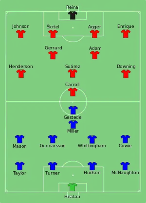 Cardiff set up in a 4–4–1–1 formation with Rudy Gestede in the striker position supported by Kenny Miller. Liverpool lined up in a 4–2–3–1 formation, with Andy Carroll starting as the lone striker, with Luis Suárez playing behind him and Jordan Henderson and Stewart Downing either side.[33] Cardiff kicked off, but Liverpool had the first chance of the match. Steven Gerrard passed the ball to Stewart Downing on the left hand side of the pitch, he passed to Glen Johnson whose shot hit the crossbar, the ball rebounded to Gerrard, but he sent his shot over the Cardiff goal.[33] Liverpool had the best of the opening minutes of the match, with Cardiff unable to keep possession of the ball.[34] Liverpool had another chance in the sixth minute; Downing went past Cardiff defender Kevin McNaughton down the left of the pitch and crossed the ball into the penalty area, which was cleared for a corner kick. The resulting corner found Andy Carroll, but his header was deflected out for another corner which was caught by Cardiff goalkeeper Tom Heaton.[34]