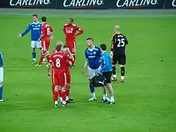 Liverpool were the first team to take a penalty, but Gerrard's effort was saved by Heaton. Cardiff's first penalty was taken by Miller, but he also missed with his shot hitting the post.[33] Adam took the next penalty for Liverpool, he also missed, placing his shot over the Cardiff goal.[34] Cowie took the next penalty for Cardiff and scored to give them a 1–0 lead. Liverpool also scored with their next penalty courtesy of Kuyt to level the shoot-out at 1–1.[35] Gestede was next for Cardiff, but his penalty hit the post. Liverpool took the lead in the shoot-out when Downing converted his penalty.[34] Whittingham was next for Cardiff and he scored to level the shoot-out at 2–2.[33] Johnson took the next penalty for Liverpool and scored, to give Liverpool a 3–2 lead and leave Cardiff needing to score or Liverpool would win. The Cardiff penalty was taken by Anthony Gerrard, but he missed his penalty, which meant Liverpool won the shoot-out 3–2 and won their eighth League Cup.[35]