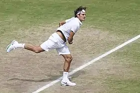 Federer finished his grass court season at the Wimbledon Championships, where he was the third seed and a six-time champion. He was bidding to equal Pete Sampras' record of seven Wimbledon titles won. Federer faced Spaniard Albert Ramos in the first round, and swept past him in less than an hour and a half, dropping only three games en route to his straight sets victory.[47] He next played Italian Fabio Fognini, and dispatched him in similar fashion, winning in straight sets after losing only six games.[48] The match was attended by The Prince of Wales and The Duchess of Cornwall, both of whom met Federer following his win.[49] In the third round, Federer faced Frenchman Julien Benneteau, whom he had lost to in their last encounter at the 2009 Paris Masters. He found himself down two sets to love after Benneteau's brilliant play won a break point in the first set and a tiebreak in the second set. However, Federer steeled himself and won the third set in less than half an hour. He then held off a comeback by Benneteau in a fourth-set tiebreak to level the match at two sets all. Federer broke Benneteau in the fifth set and held his lead to close the match out in three and a half hours.[50] Federer's win over Benneteau marked the second time in the season and the eighth time in Federer's career that he came back from two sets down to win the match. Federer played Belgian Xavier Malisse in the fourth round, and recorded his 850th match win over four sets. Federer was down a break in the first set but broke Malisse back to force a tiebreak, which he won handily. After dropping only one game en route to winning the second set. Federer found his serve broken in the third set, which allowed Malisse to take a set off of Federer. Federer then broke Malisse in the middle of the fourth set to secure the lead, which he held to win the match in just over two hours.[51] He faced Mikhail Youzhny, whom he has an undefeated record against, in the quarterfinals. In a match attended by The Duke and Duchess of Cambridge, Rod Laver, and Andre Agassi and his wife Steffi Graf, Federer steamrollered over Youzhny in just over one and a half hours, dropping only five games in his victory.[52]