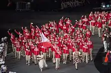 During the parade at the opening ceremony, each petal was carried by a child accompanying each of the teams as they entered the stadium.[23] The children wore gloves to avoid staining the copper. The petals (except from the independent athletes)[23] were then passed secretly to fifteen technicians who, out of sight in the centre of the stadium, fitted them to the ends of the stainless steel stems as they lay flat on the ground.[11][12] Its location was kept secret until the event; during the ceremony some people had speculated that it might be hidden under the Glastonbury Tor model at the end of the stadium.[6]