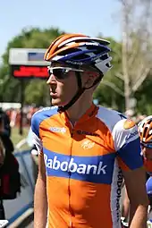 The race included three categorized climbs, including a finish at the base of the Mount Baldy ski lifts, an ascension that would take the riders to an altitude of 1,950 metres (6,400 ft).[28] Right from the start, a breakaway formed, initiated by Jens Voigt (RadioShack–Nissan) and Dries Devenyns (Omega Pharma–Quick-Step). After 20 kilometres (12 mi) of racing, the break had ballooned to 14 riders, including four units from the RadioShack–Nissan squad. Back in the group, general classification contender Tejay van Garderen of BMC Racing Team survived a scare when he punctured while descending the first categorized difficulty of the day, but a teammate was there to promptly give him his wheel.[29] Chris Horner (RadioShack–Nissan), who was part of the break, left the escapees behind, accompanied by Darwin Atapuma of Colombia–Coldeportes. At one point, the duo enjoyed a 3' 50" advantage over the bunch and David Zabriskie, making Horner the virtual leader. On the slopes of Mount Baldy, with 5.5 kilometres (3.4 mi) to go, the chasing bunch was reduced to 15 riders including Zabriskie. Rabobank's Robert Gesink then accelerated toward the top of the climb, dropping everyone in his group except Tom Danielson (Garmin–Sharp) who was the last to go away. Gesink caught Atapuma near the final kilometer banner, was passed by the Colombian on the inside in the penultimate turn, passed him again but took the final left bend very wide, almost colliding with the barriers. Gesink produced a last sprint that would carry him over the line as the victor.[30] With that victory, Gesink took the yellow jersey. He stated: “This is amazing. At the end of last year I crashed and broke my leg. In January I still had to learn how to walk. Now I’m back. I’ve been working really, really hard the last few months.”[31]