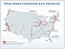 - No new funding for long-distance intercity and high-speed rail was included in the budget.[29] This funding had originally been introduced as part of the American Recovery and Reinvestment Act stimulus bill in 2009, but had proved controversial as several Republican governors elected in the 2010 elections subsequently rejected the federal funding for rail projects in their states. However, funding for 26 short-distance routes eliminated in the House version was restored in the enacted bill.[39]